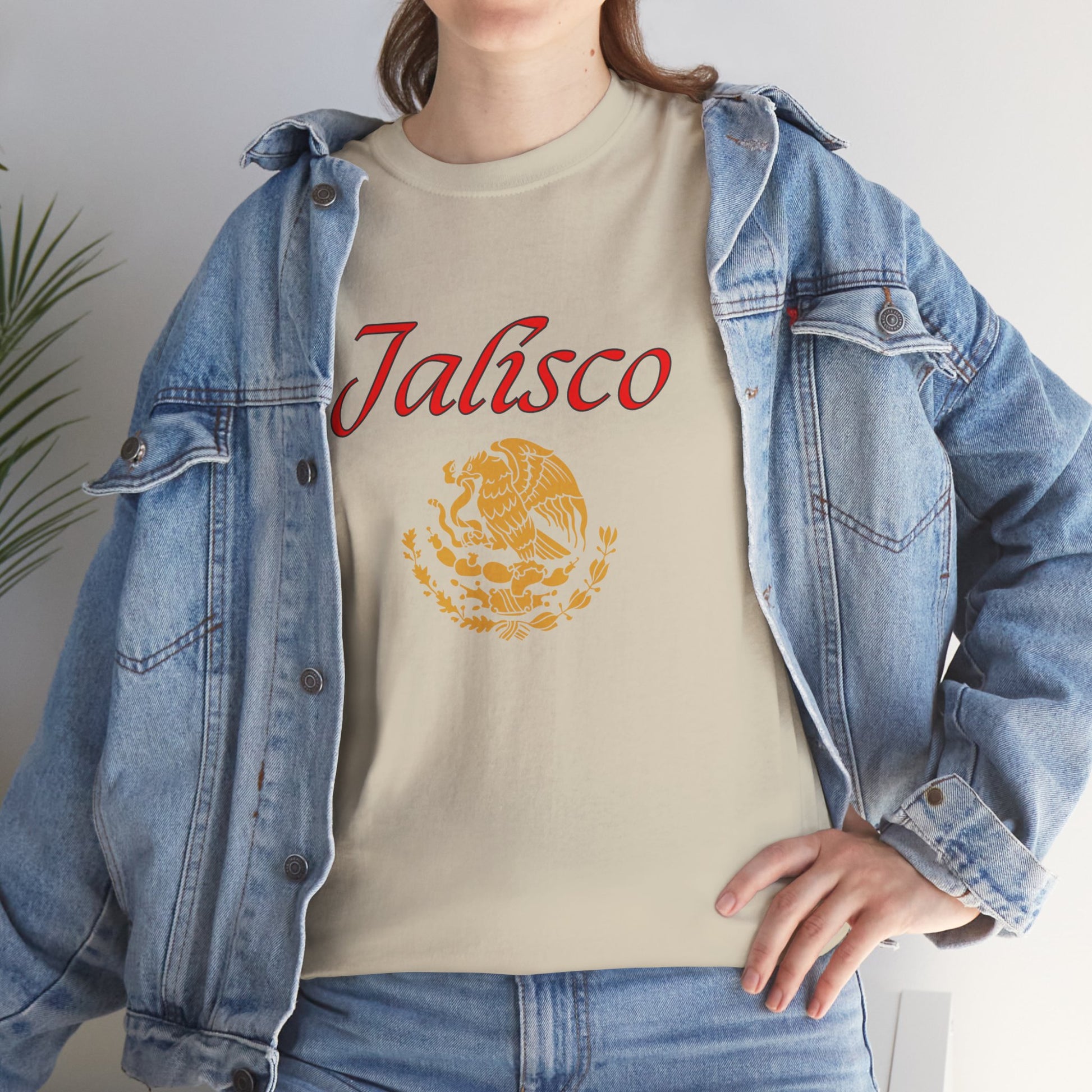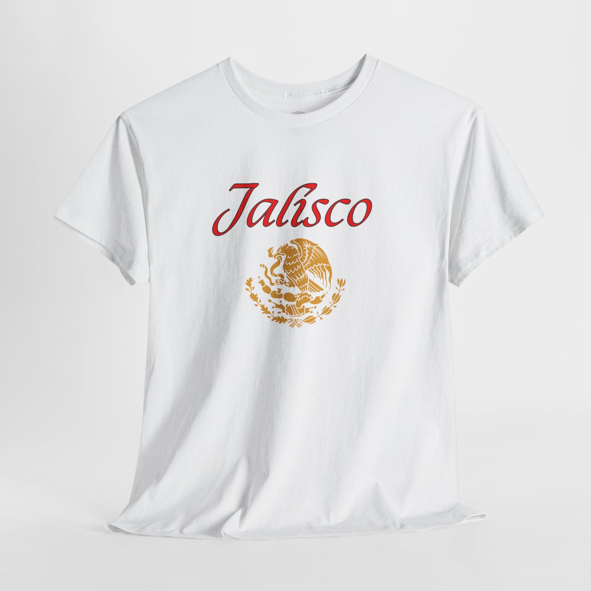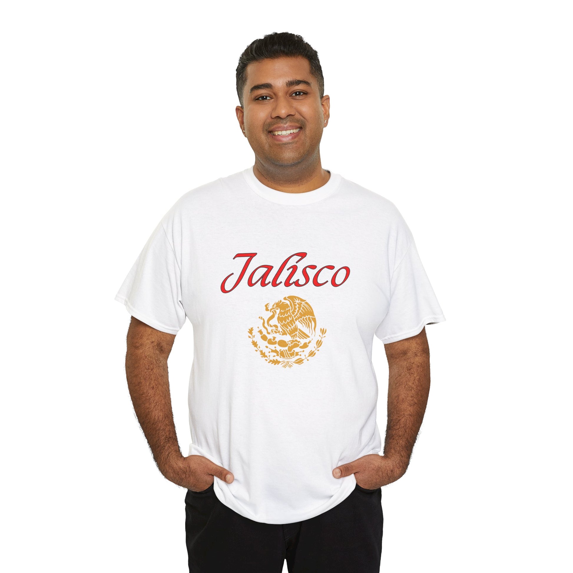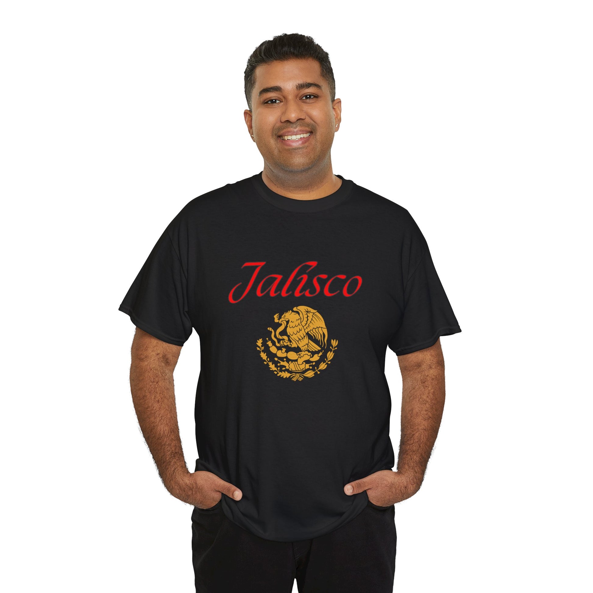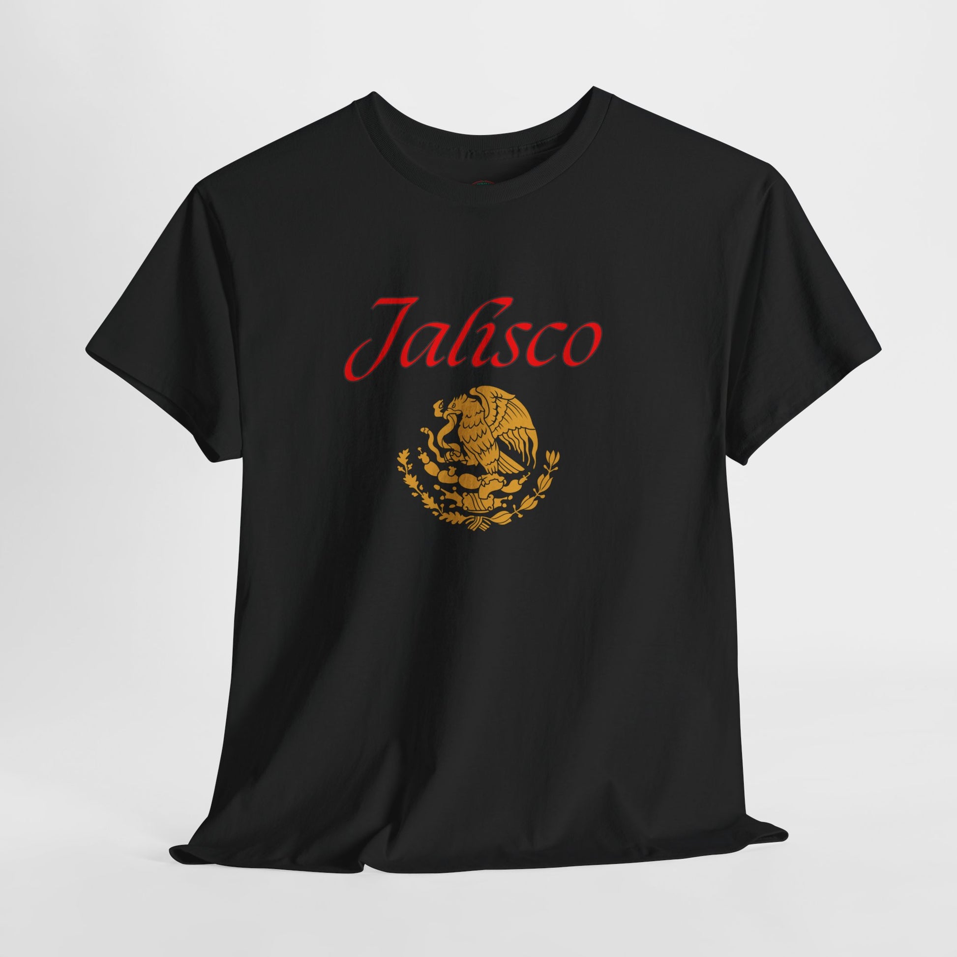 Celebrate the heart of Mexico with this bold tribute to Jalisco, the birthplace of mariachi, tequila, and rich cultural traditions. This premium black tee features "Jalisco" in striking red script, beautifully complemented by Mexico's iconic golden eagle emblem and the state silhouette in vibrant flag colors.