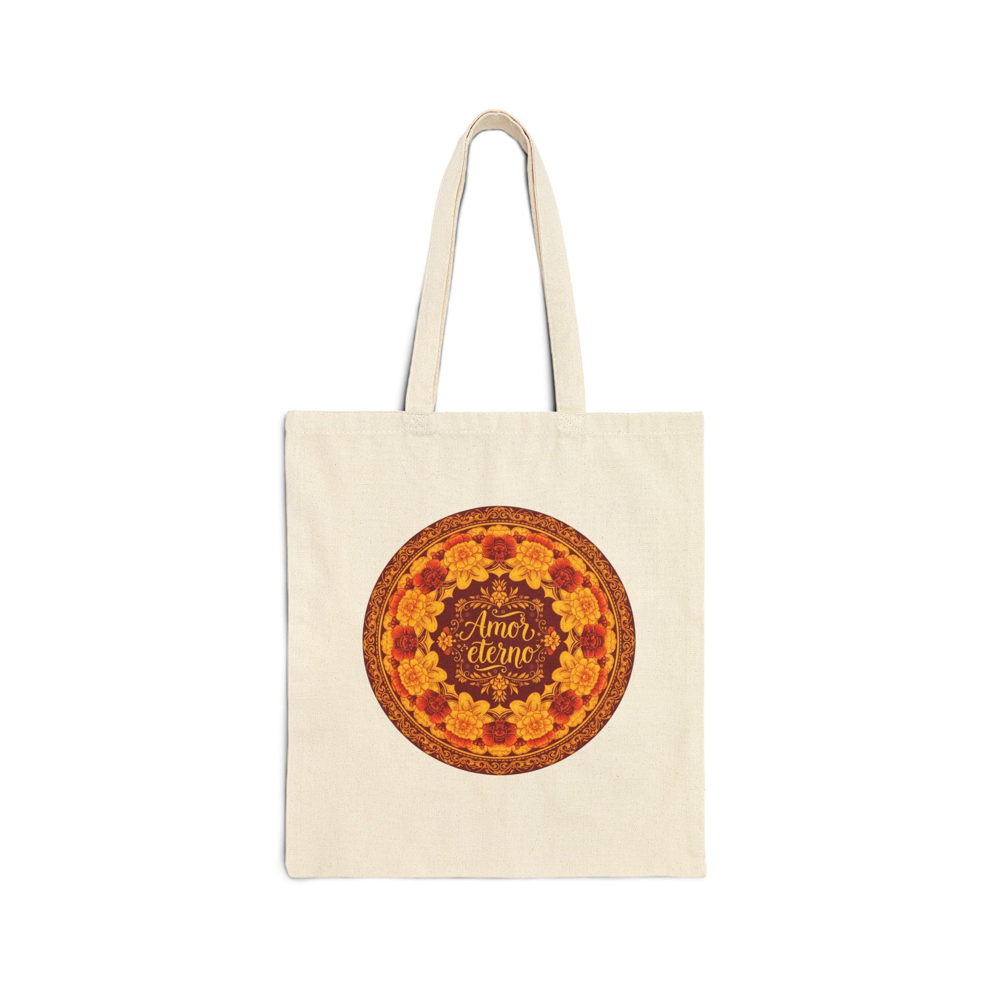 ✨ What Makes This Special: • Hand-designed cempasúchil (marigold) mandala artwork in vibrant oranges and golds • Meaningful "Amor Eterno" message celebrating love that never ends • Durable, high-quality canvas construction for everyday use • Spacious interior perfect for shopping, books, or daily essentials • Comfortable shoulder straps for all-day wear • Authentic Day of the Dead symbolism with modern style