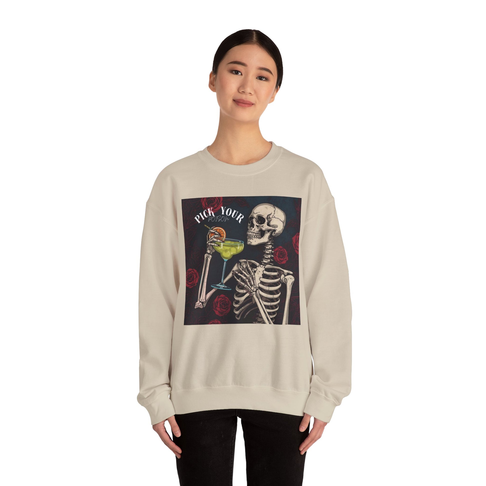 Cozy up with a little spooky sass. The Pick Your Poison Crewneck features a bold skeleton graphic casually sipping a drink alongside the cheeky quote “Pick Your Poison.” It’s the perfect mix of dark humor and everyday comfort, making it a standout piece for Halloween season or year-round streetwear fits.
